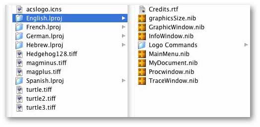 You can see the .nib files, which are the interface files representing menus, windows, etc. The Logo commands folder contains the help files.