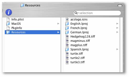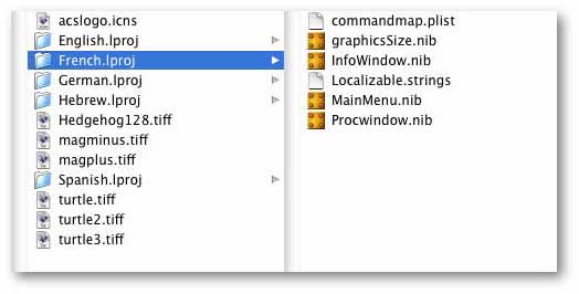 In this folder, you can see an icon and some TIFF images that are used by the program, and also a number of language folders such as English.lproj and French.lproj. It's these folders that we're interested in. English.lproj is the ÔoriginalÕ folder that holds all the english language resources. You can see that some localisation has been done for German, French, and Spanish. To add another language, you would create an additional folder for that language.