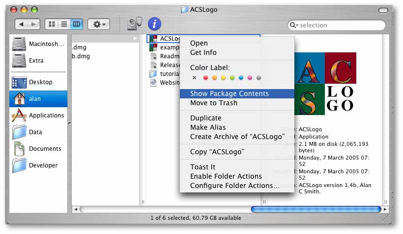 In the Finder, a program looks like a single file. In fact it is a 'bundle' Ñ a directory of files and sub-directories including the runnable code and a number of resources. To see the structure, right-click (control-click) on the ACSLogo icon and choose ÔShow Package contentsÕ: