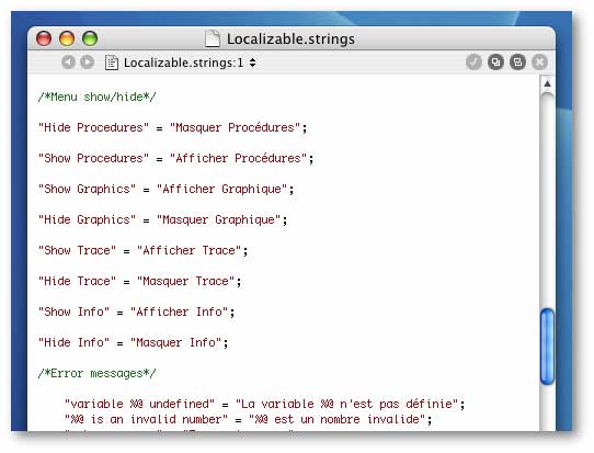 A number of lines of the form English string = translated string. So for instance, the translation for Show Info is Afficher Info. To create your own translation, copy this file into your .lproj folder and translate each string in the file.