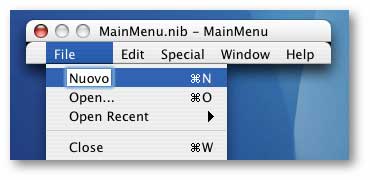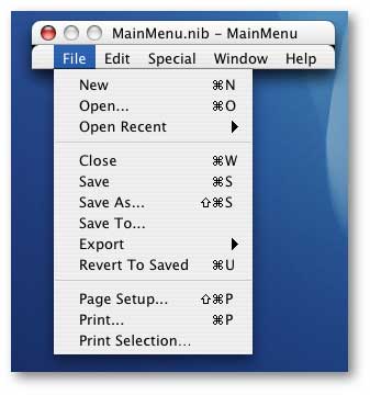 We'll start with the ACSLogo menus. Copy MainMenu.nib from English.lproj into your new .lproj folder. Double-click on the file to open it up. As long as you've installed the developer tools correctly, thisŐll start up the Interface Builder program.